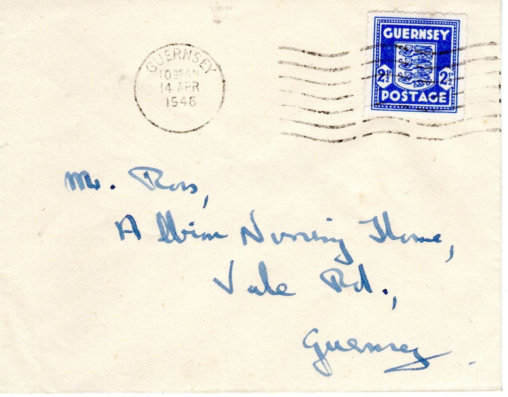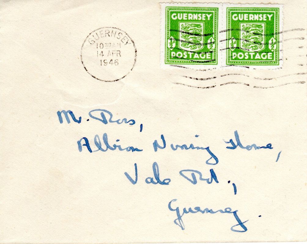 | 710 | GUERNSEY - 14 April 1946 local cover addressed to the Albion Nursing Home, Vale Road, Guernsey. With 2 x ½d Arms stamps with Guernsey machine cancel | 4.00 | 4.00 | |