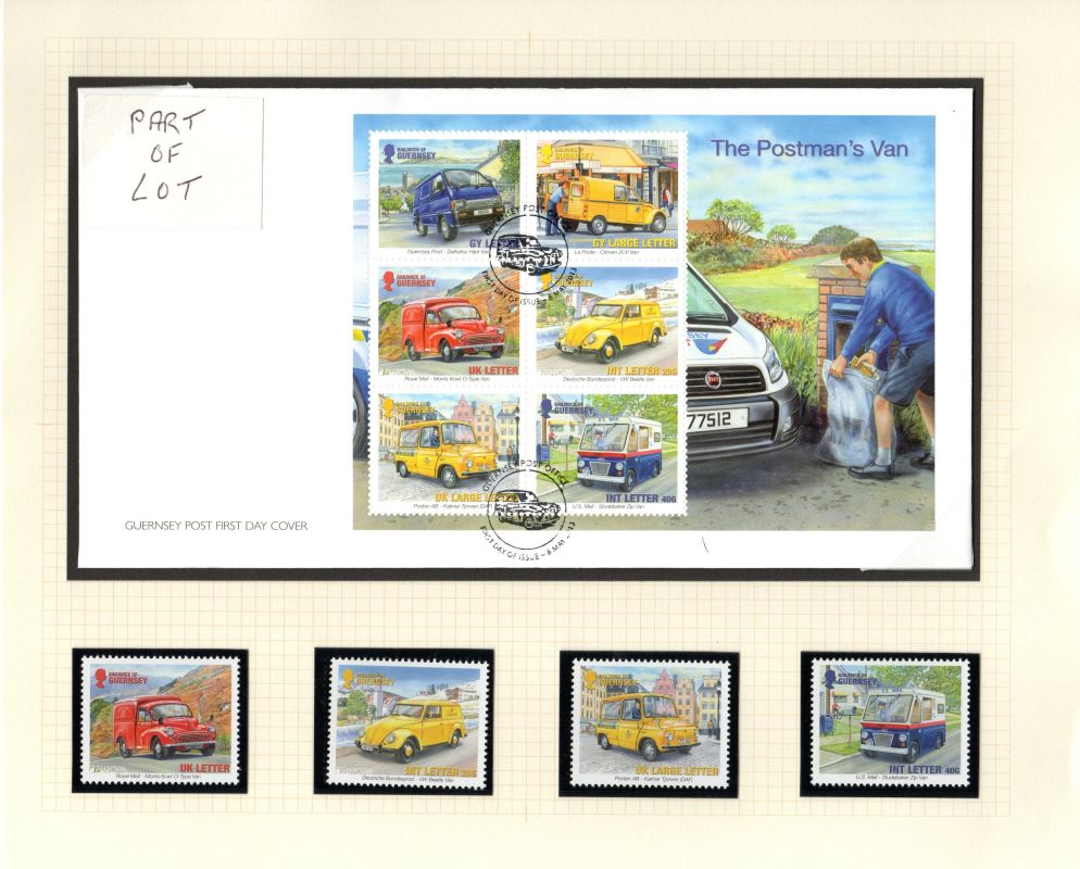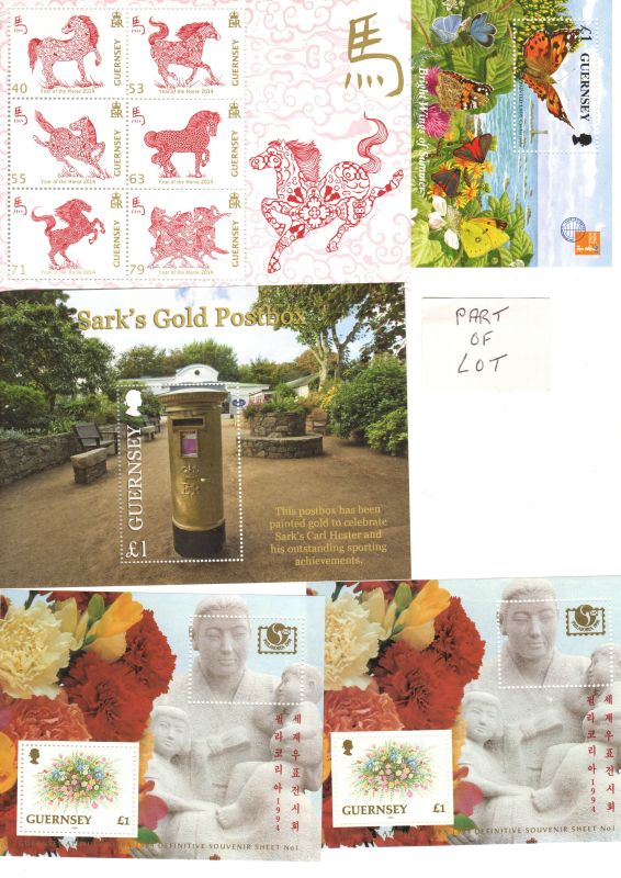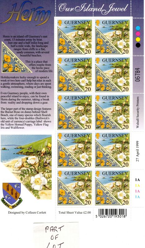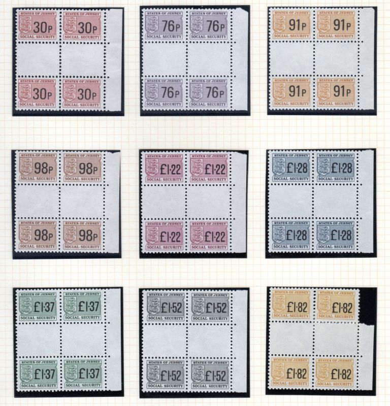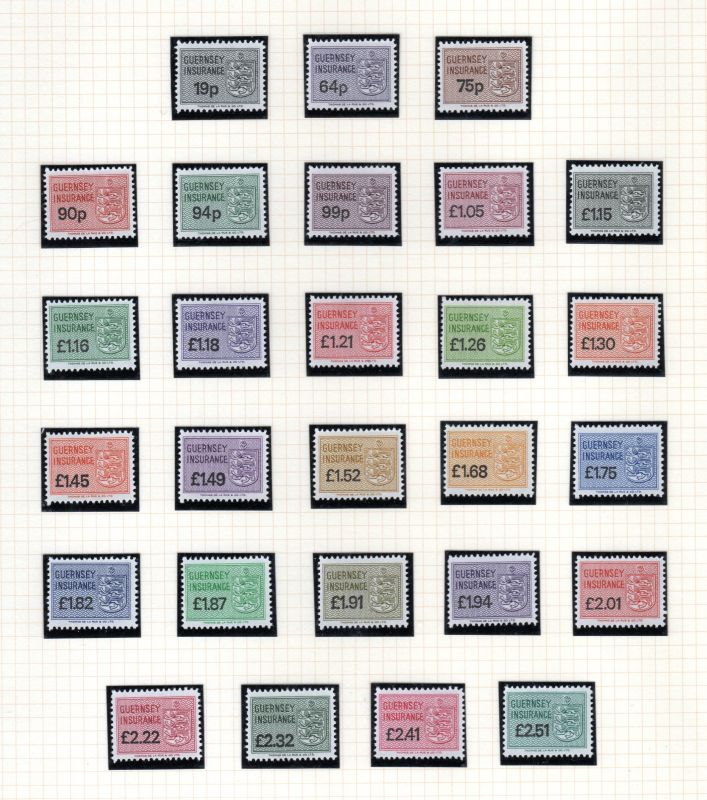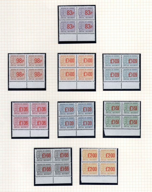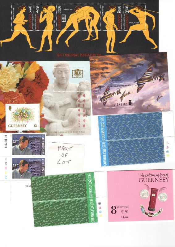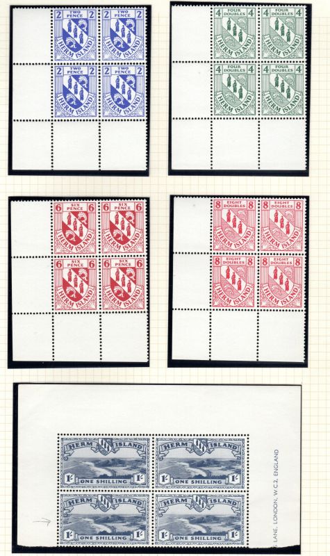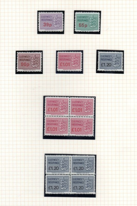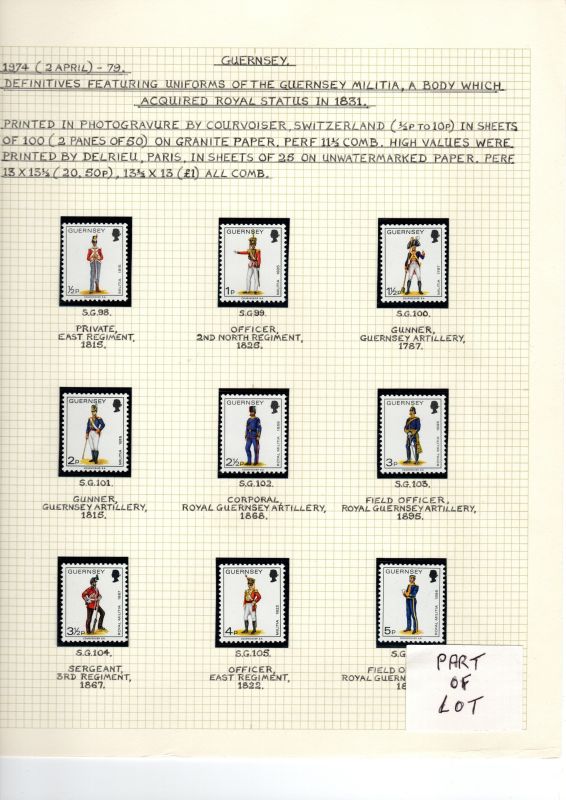 | 698 | GUERNSEY - Very nicely written up collection of 1974-79 Guernsey Militia defintives (16 pages) including gutter blocks of 4 to 10p (also second printing) and 20p - £1 in fine corner blocks of 4. Multi-value sheets strips for booklets also included. Also Guernsey 1980 coin set to £5. | 15.00 | 21.00 | |