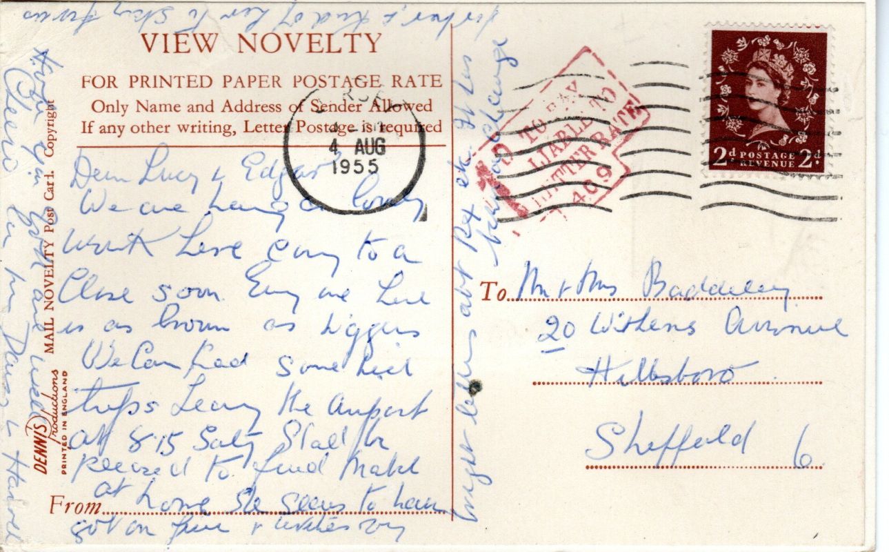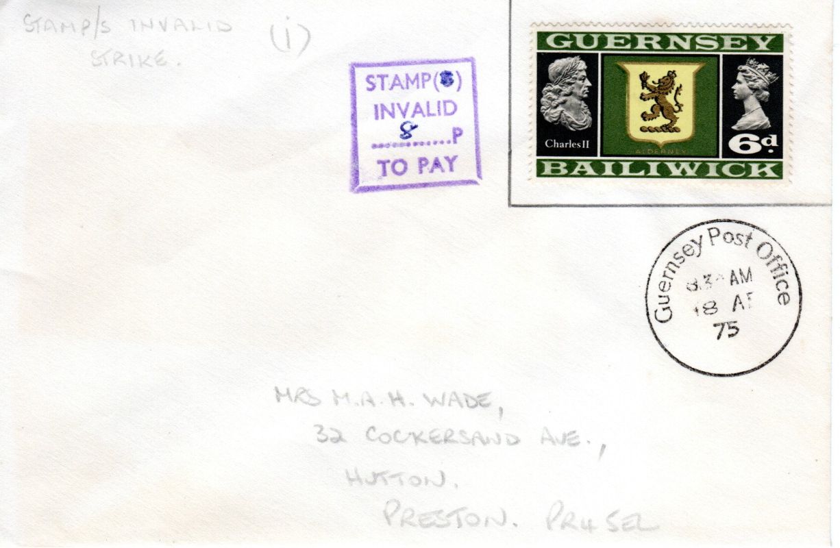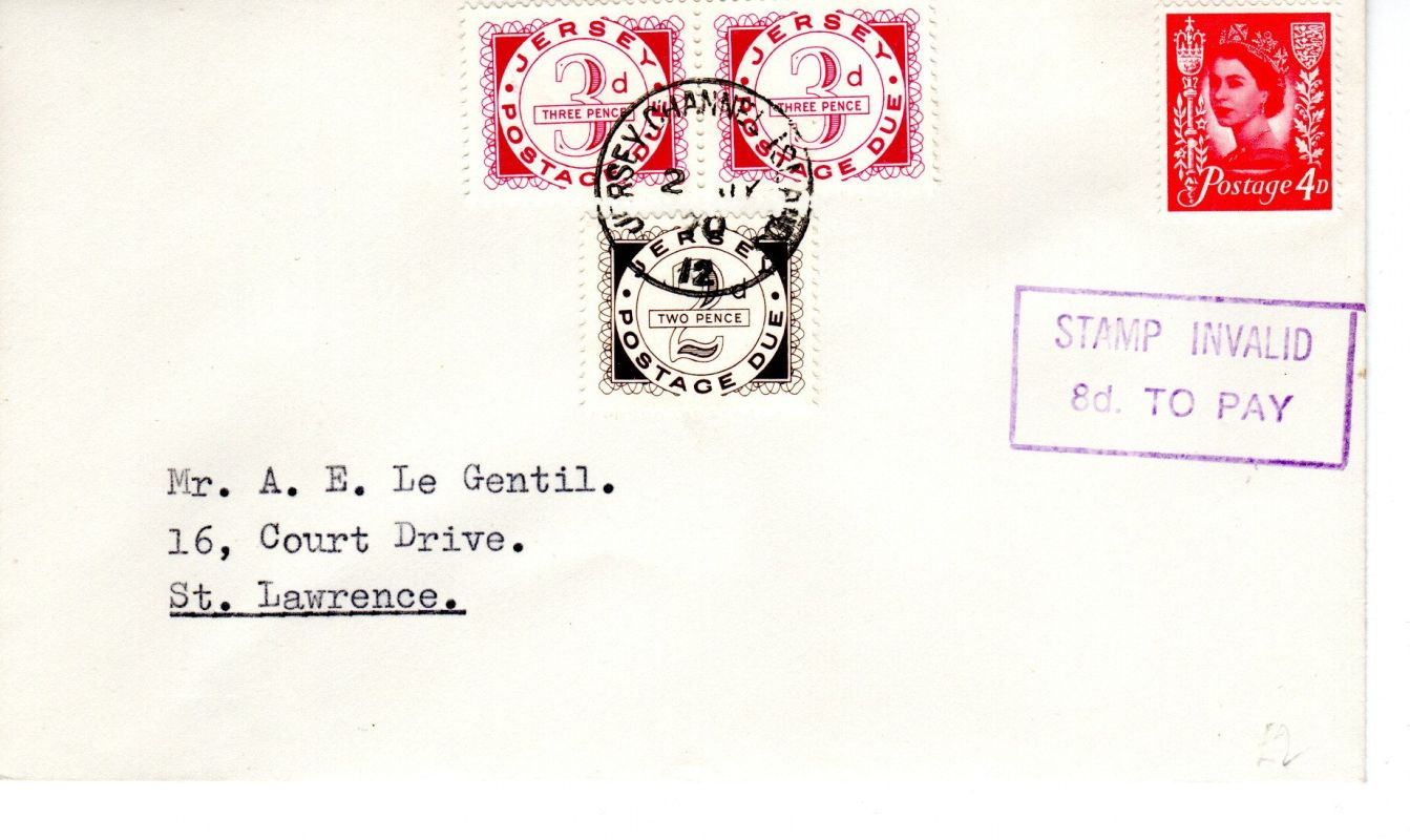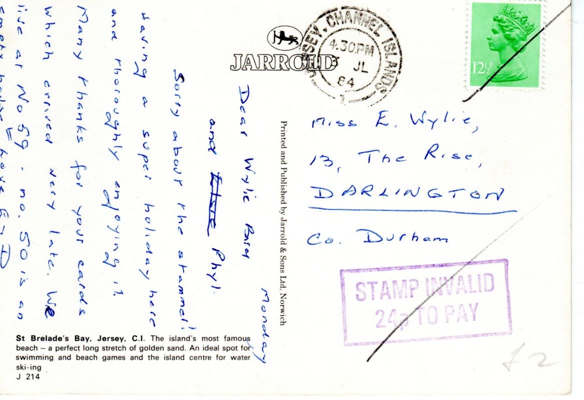 | 713 | JERSEY - 1984 Postcard to Durham with invalid GB stamp. With Jersey surcharge mark - STAMP INVALID / 24P TO PAY' | 3.00 | | |