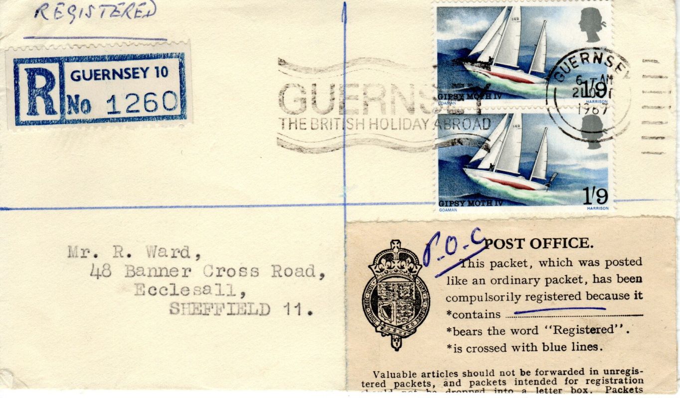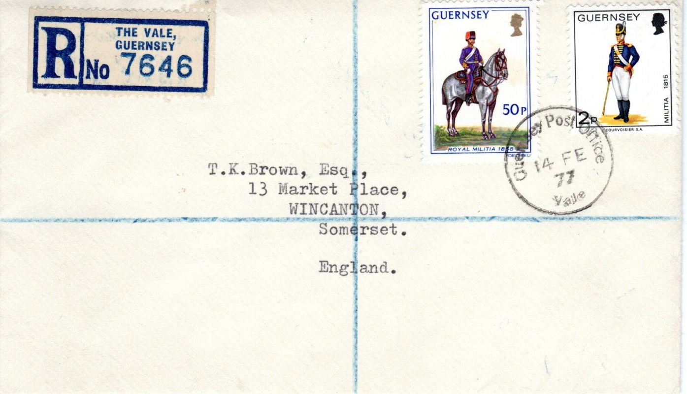 | 712 | GUERNSEY - 1977 registered cover to Somerset. With VALE datestamps & 'THE VALE/ GUERNSEY' registration label | 5.00 | 13.00 | |