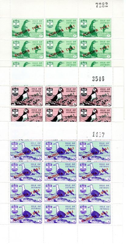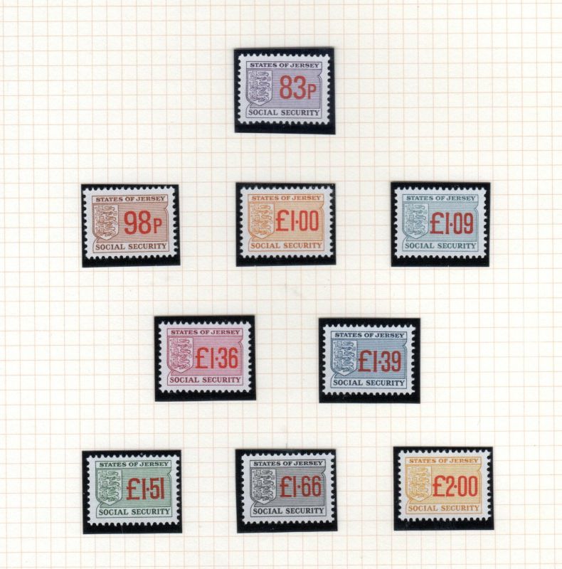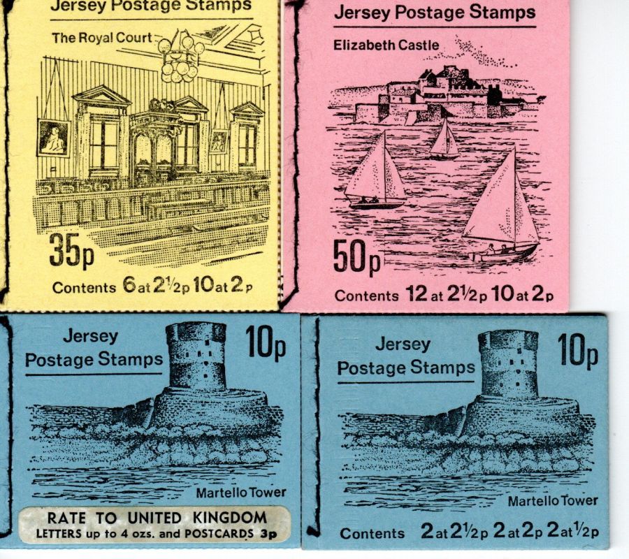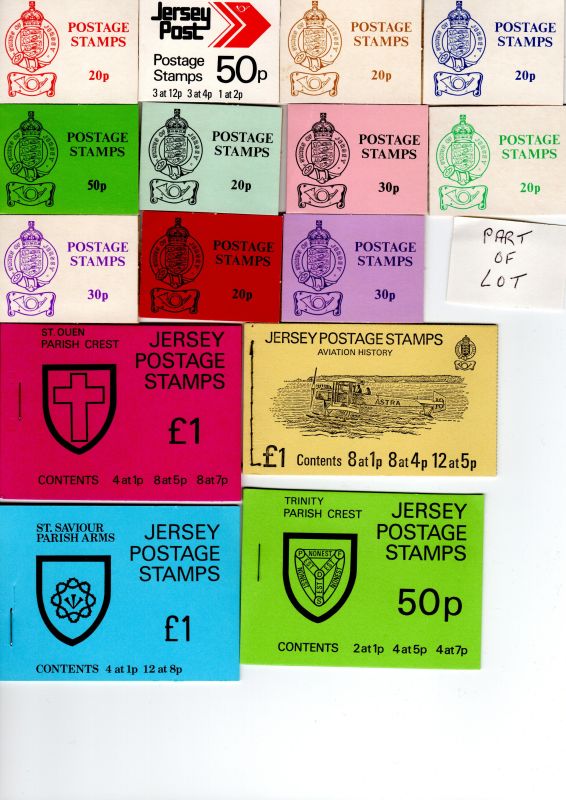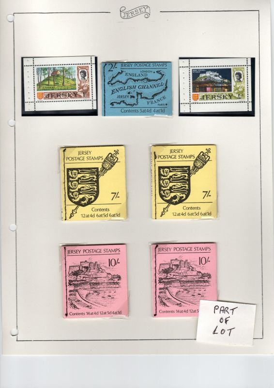 | 702 | JERSEY - Booklets. Almost complete run of booklets SB1 - SB40 (No SB2a, 3a, SB33, 36 &39 or sachets). 63 booklets including the upright and inverted panes in the earlier decimal booklets. Single panes from the Arms series are also displayed. On album pages in Gibbons 4 ring binder. Cat. £230+ Face £40+ | 35.00 | | |