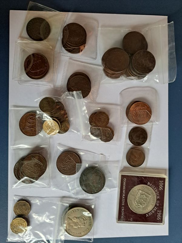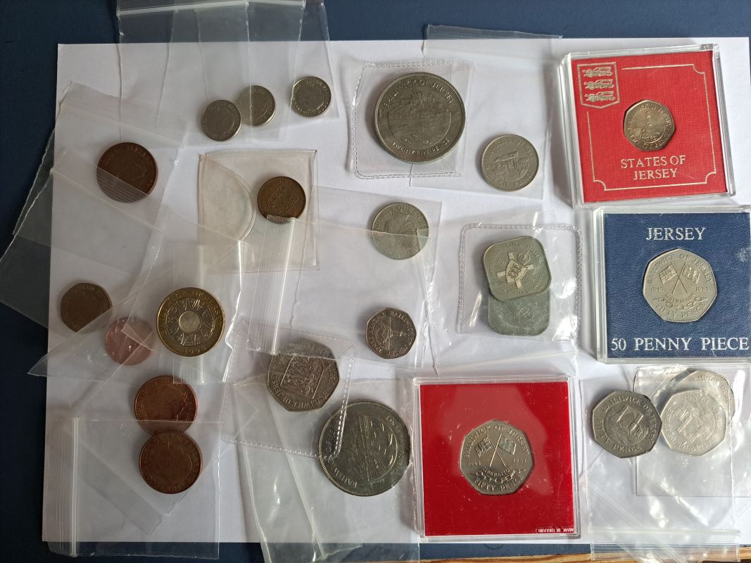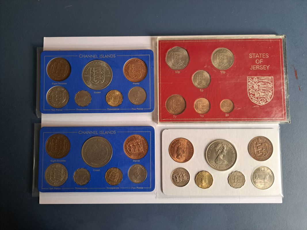 | 691 | GUERNSEY & JERSEY - Souvenir packs containing a mixture for Guernsey and Jersey coins - 1d, 3d, 5p, 10p, 1/12th shilling, 8 doubles and either a Jersey 5/- or 25p (3 packs) which retailed at £5 each. Plus a Jersey 1968/71 year pack UC. (4 packs) | 4.00 | 11.00 | |