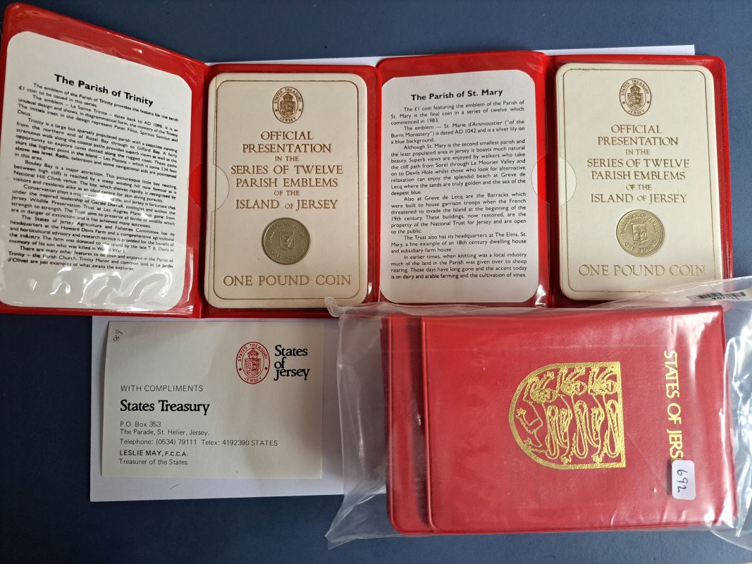 | 688 | JERSEY - 1984-89 - Set of 11 of the 12 £1 coins with the Parish Emblems. All in their presentation packs. Some with a compliment slip from the States Treasurer. BU. | 15.00 | 65.00 | |