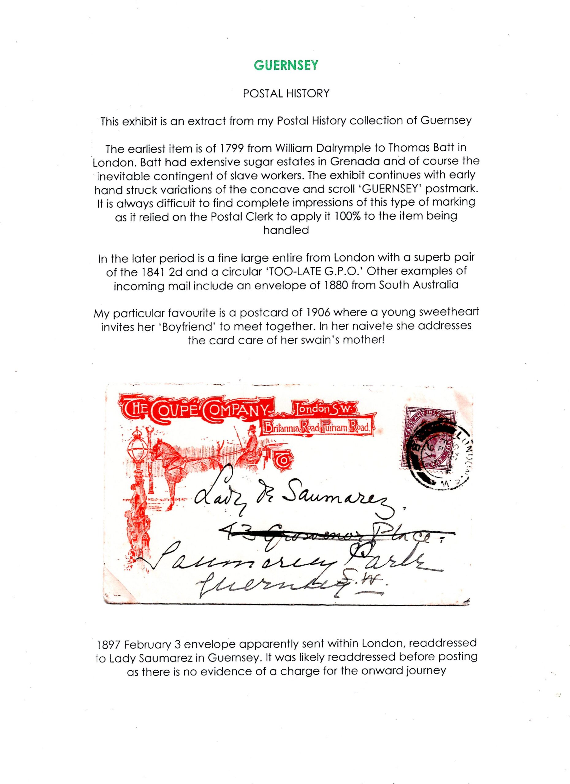 Guernsey Postal History Exhibitor: Richard Ashton This exhibit is an extract from my Postal History collection of Guernsey. The earliest item is of 1799 to Thomas Batt in London. Batt had extensive sugar estates in Grenada. There are early variations of the concave and scroll \'GUERNSEY\' postmark. In the later period is a large entire from London with a pair of the 1841 2d and a circular \'TOO-LATE G.P.O.\' My particular favourite is a postcard of 1906 where a young sweetheart invites her boyfriend to meet together. In her naivete she addresses the card care of her swaine's mother! Class: Postal History Entered in: CISS Annual Competition 2026