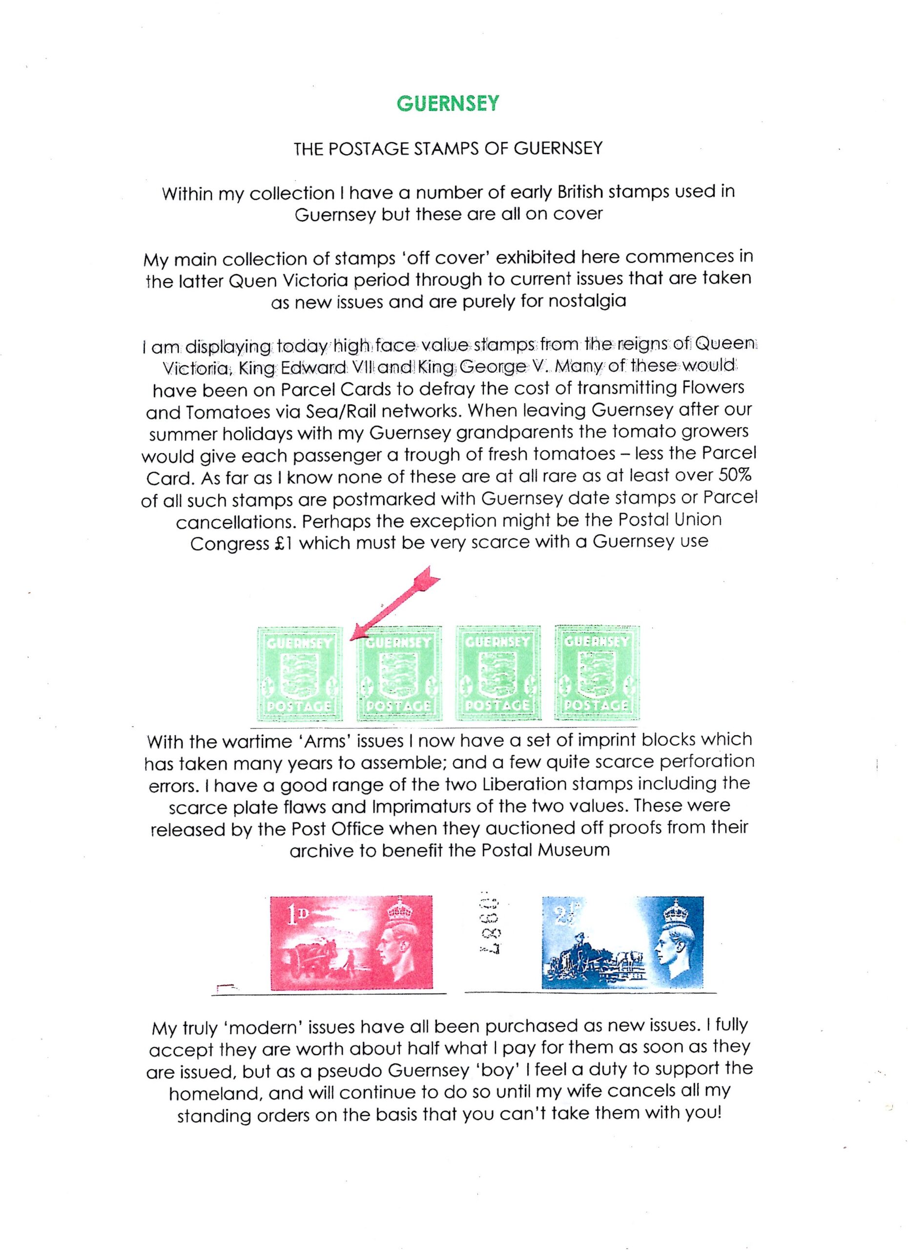 Guernsey Stamps Exhibitor: Richard Ashton My main collection of stamps 'off cover' exhibited here commences in the latter Queen Victoria period through to modern issues. The high face value stamps of Great Britain with Guernsey postmarks are from Queen Victoria to King George V with scarce King Edward VII £1 values and a King George V Postal Union Congress £1 which must be very scarce used in Guernsey. The wartime 'Arms' issue include some scarce perforation varieties and a complete set of 'imprint' blocks that has taken many years to put together. There is a pair of the Liberation Imprimaturs Class: Stamps Entered in: CISS Annual Competition 2026